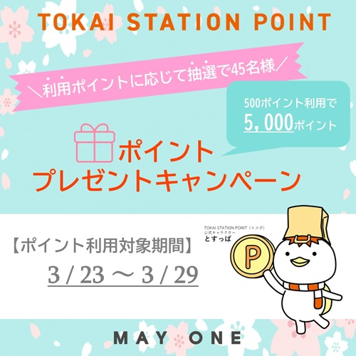 対象期間にメイワン・エキマチ・ビックカメラ館でのTOKAI STATION POINT(トスポ)利用ポイント応じて抽選でポイントが当たるキャンペーンを開催!この機会にメイワンでのお買物をお楽しみください♪